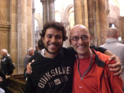 Nach der Messe, ich kniete noch in meiner Bank, klopft mir jemand auf die Schulter. Ich drehe mich rum und kann es nicht glauben: Thiago, Brasilianer steht hinter mir ( er hat mich in den Pyreneen auf den richtigen Weg gebracht und wir haben diese dann -gemeinsam mit Cemi- ueberwunden).